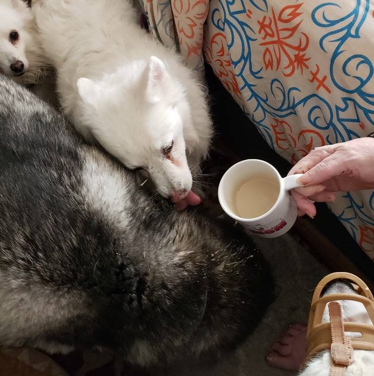 White Dog is not a member of the WDA Coffee Club (in face she is the only one who is not) but she came out to join us in solidarity for National Coffee Day this morning.